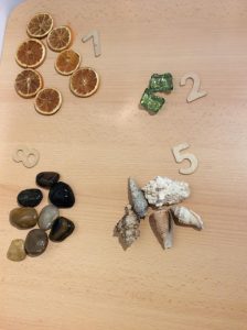 We have been encouraging counting and sorting today with natural materials and loose parts. Not only does this support progression of the children’s mathematical skills but with the mix of resources – communication, language and social development are supported.