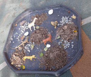 Small world play has many learning and development benefits for children, and it’s completely accessible, requiring very few resources. Some of the best small world play comes from everyday objects; cardboard boxes that become a zoo enclosure, a plant pot that becomes a fairy garden, an empty tube that’s a train tunnel. Add in some natural resources – some leaves from the garden, flour if it’s snowing in your small world, a wooden spoon to become a slide for the swimming pool. Most small worlds will then have a ‘toy’ such as a person, car, animal figurine to act out the child’s imagination.